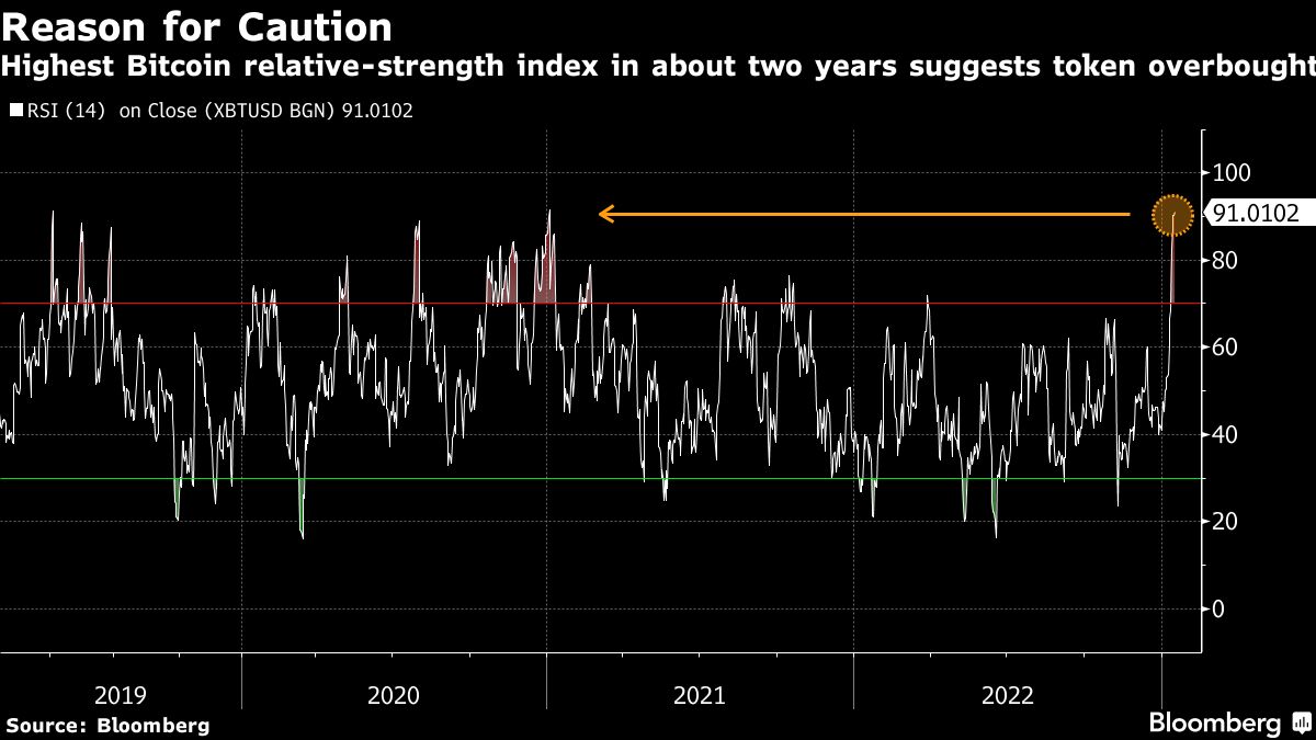 Meanwhile, some technical indicators suggest Bitcoin’s jump is becoming stretched. The token’s 14-day relative-strength index — a measure of momentum — has scaled 90. That’s far above the 70 level viewed as “overbought” and the highest in about two years.
