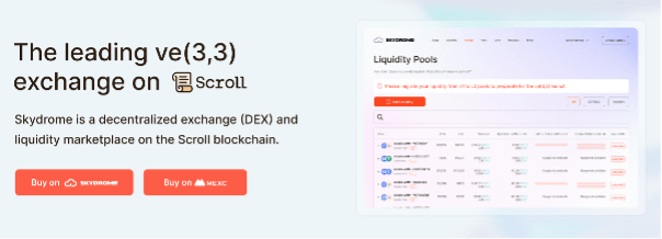 Positioned at the forefront of Scroll’s DeFi ecosystem, Skydrome is a decentralized exchange (DEX) with a vision to redefine liquidity provision through its innovative ve(3,3) tokenomics design. Despite its relatively recent entry into the crypto space, Skydrome has swiftly risen to prominence on the Scroll blockchain.
