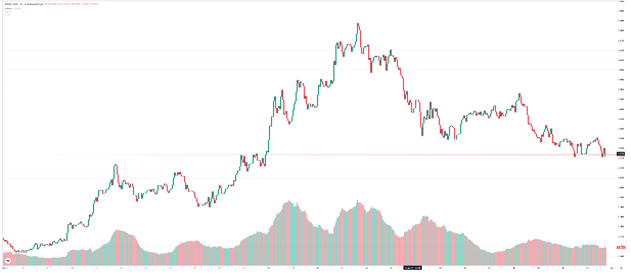 Looking at the chart, DOGE recently pushed up to that magenta resistance zone around $0.278 but couldn’t break through. Since then, it’s dropped down to the lower magenta support area near $0.21975, and that’s where all eyes are focused now.