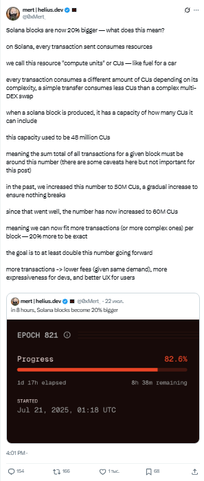 The timing isn’t random either. Solana just upgraded its network on July 22, boosting block capacity by 20% to 60 million compute units. Mert Mumtaz from Helius explained on X that this lets the network handle way more transactions per block. Think of it like adding more lanes to a highway.