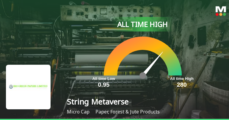 String Metaverse, a microcap company in the Paper, Forest & Jute Products sector, has achieved an all-time high of Rs. 280, reflecting a recent upward trend. Despite some erratic trading and underperformance against its sector today, it has shown strong long-term gains, significantly surpassing the Sensex over five years.