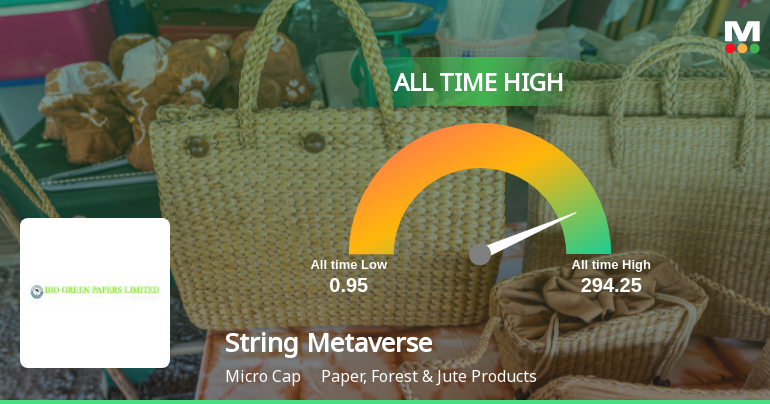 String Metaverse has achieved a significant milestone by reaching an all-time high of Rs. 294.25 on October 20, 2025. This remarkable performance underscores the company’s strong position within the Paper, Forest & Jute Products industry. The stock has demonstrated impressive momentum, outperforming its sector by 4.06% today alone.