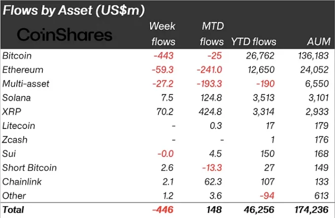 Last week, crypto investment products recorded net outflows totaling $446 million. This development pushed cumulative withdrawals since the early October market shock to $3.2 billion.
