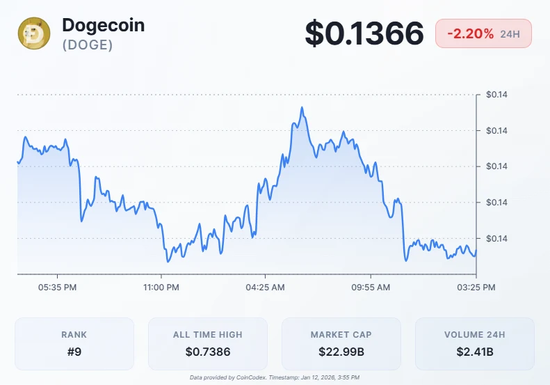 Dogecoin traded at $0.1366 at the time of writing, representing a 2.20% decrease over 24 hours. The price remained relatively stable despite the regulatory milestone, fluctuating between $0.135 and $0.142 during early trading sessions.