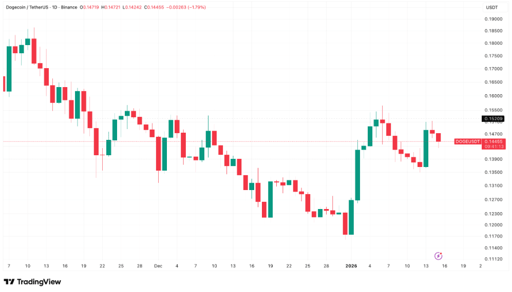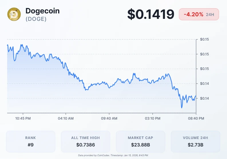 Dogecoin is approaching a pivotal moment in its price trajectory. At the time of writing, DOGE is trading at around $0.1419, down 4.20% over the last 24 hours.