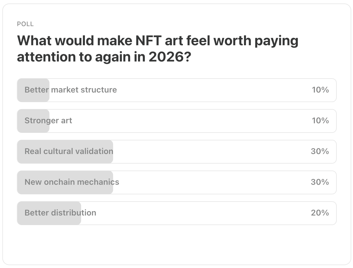 Last week’s poll drew a pretty clear roadmap for what you’d need to see before giving NFT art real attention again in 2026. The top two answers tied: Real cultural validation (30%) and New onchain mechanics (30%). Right behind them was Better distribution (20%), while Better market structure (10%) and Stronger art (10%) trailed far back.