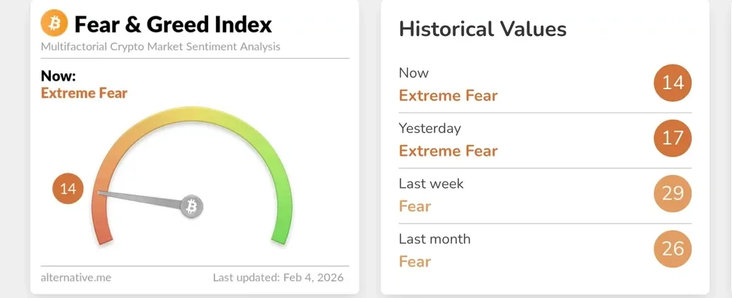 Market sentiment reached extreme levels on Wednesday. The Alternative Fear and Greed Index fell to 14, down from 17 on Tuesday. This reading indicated extreme fear had taken hold of the cryptocurrency market.