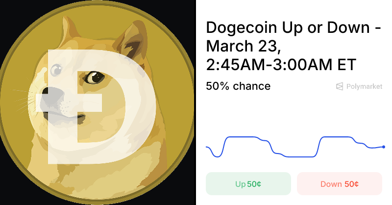 Polymarket odds are set by real traders putting real money behind their beliefs. “Dogecoin Up or Down – March 23, 2:45AM-3:00AM ET” is still building its trading base for this window, so the current Up/Down probabilities may reflect only a small number of trades. As more participants enter before the window closes, the odds will become increasingly robust. For the latest stats on Polymarket’s overall prediction accuracy, visit the accuracy page on Polymarket.