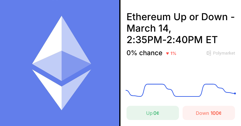 Polymarket odds are set by real traders putting real money behind their beliefs. “Ethereum Up or Down – March 14, 2:35PM-2:40PM ET” is still building its trading base for this window, so the current Up/Down probabilities may reflect only a small number of trades. As more participants enter before the window closes, the odds will become increasingly robust. For the latest stats on Polymarket’s overall prediction accuracy, visit the accuracy page on Polymarket.