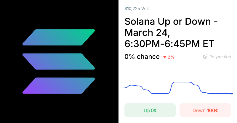 Polymarket odds are set by real traders putting real money behind their beliefs. “Solana Up or Down – March 24, 6:30PM-6:45PM ET” is still building its trading base for this window, so the current Up/Down probabilities may reflect only a small number of trades. As more participants enter before the window closes, the odds will become increasingly robust. For the latest stats on Polymarket’s overall prediction accuracy, visit the accuracy page on Polymarket.