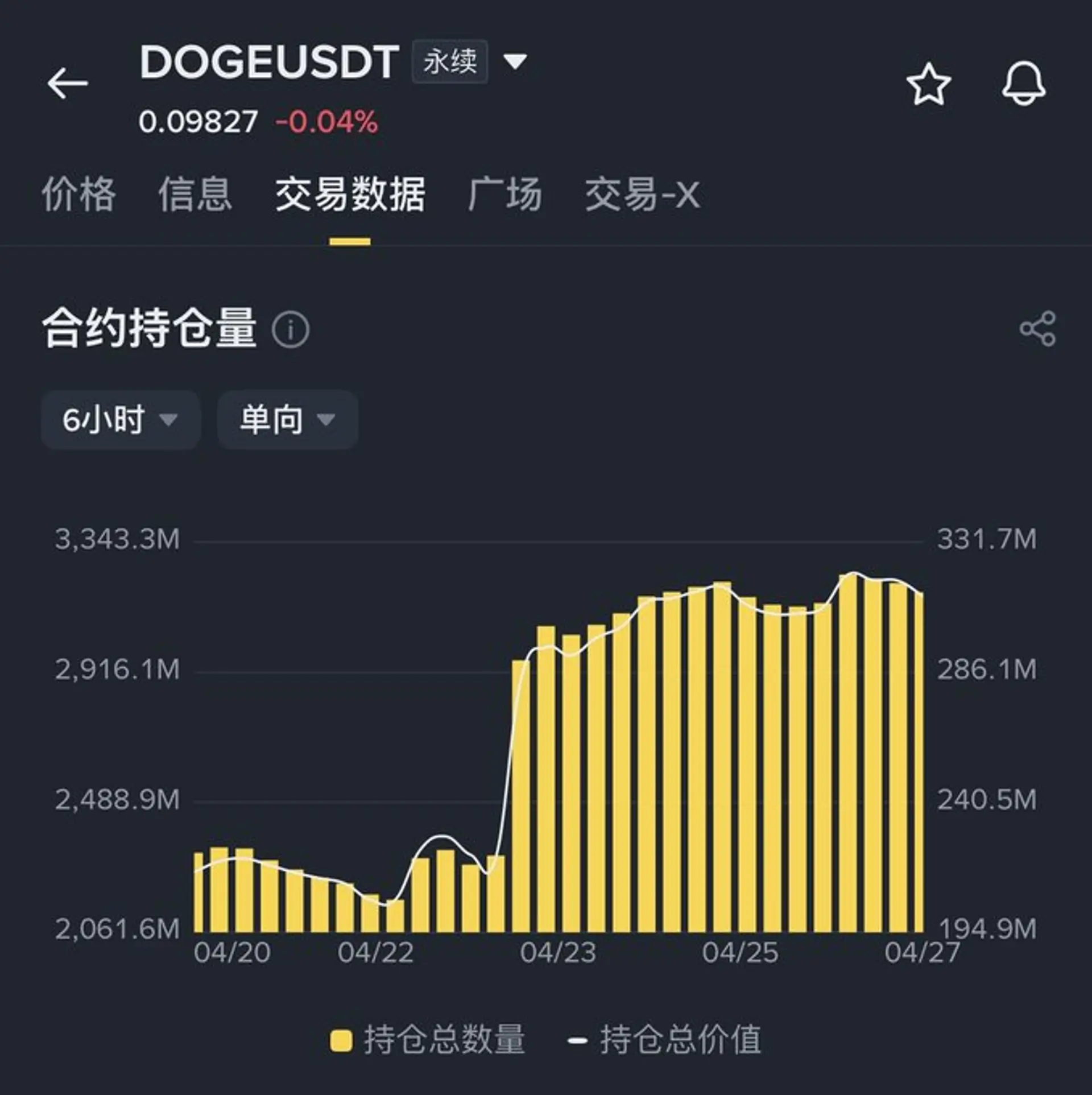 Since April 23, open interest has increased to 3.23 billion DOGE from 2.31 billion DOGE, a gain of about 920 million DOGE.