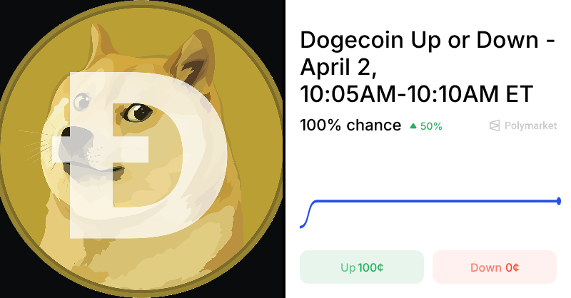 Polymarket odds are set by real traders putting real money behind their beliefs. “Dogecoin Up or Down – April 2, 10:05AM-10:10AM ET” is still building its trading base for this window, so the current Up/Down probabilities may reflect only a small number of trades. As more participants enter before the window closes, the odds will become increasingly robust. For the latest stats on Polymarket’s overall prediction accuracy, visit the accuracy page on Polymarket.
